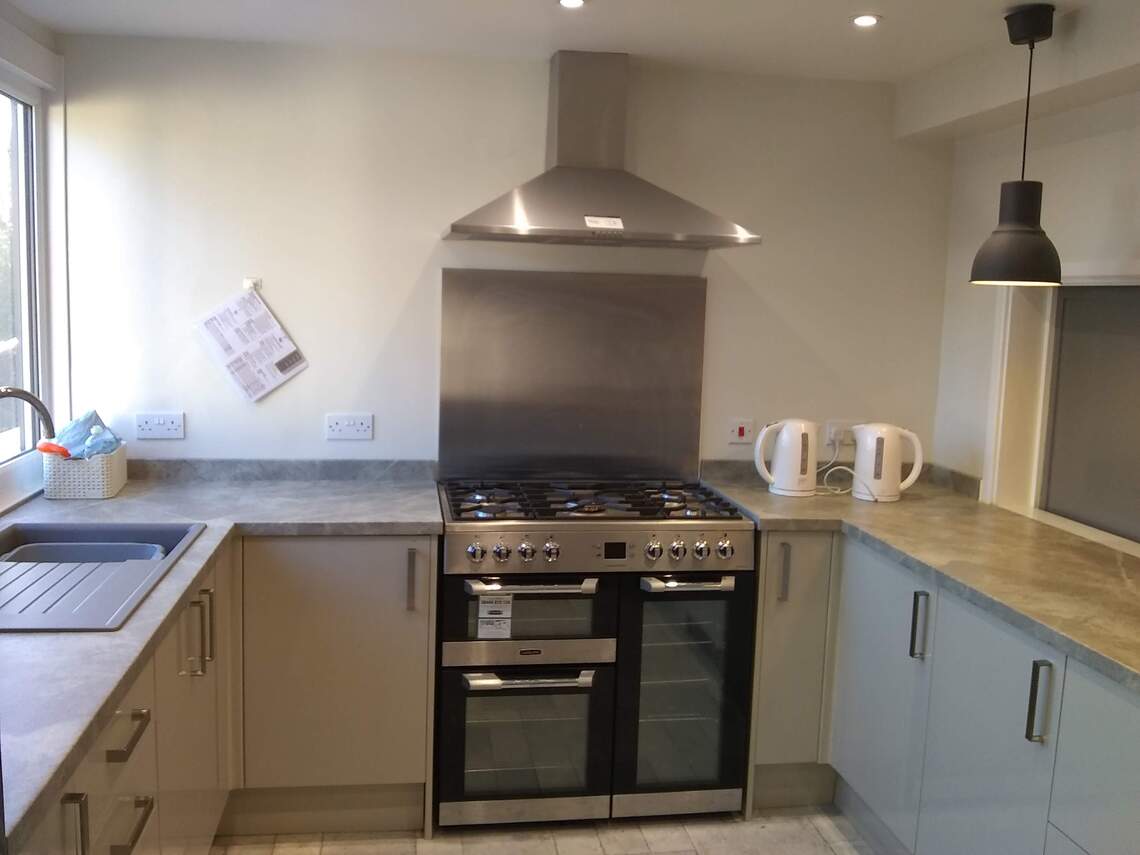 The Kitchen is equipped with a modern Gas & Electric Range Cooker, Microwave oven and Fridge Freezer. Two electric kettles are provided but no kitchen cooking utensils. There are some plates, cups, saucers and cutlery.